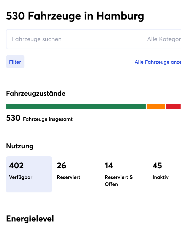 Wenn Ihre Flotte mit unserer Software verbunden ist, haben Sie die volle Kontrolle. Sie können den Status Ihrer Fahrzeuge verfolgen, den Betrieb verwalten und Ihre Kunden unterstützen — alles an einem Ort.