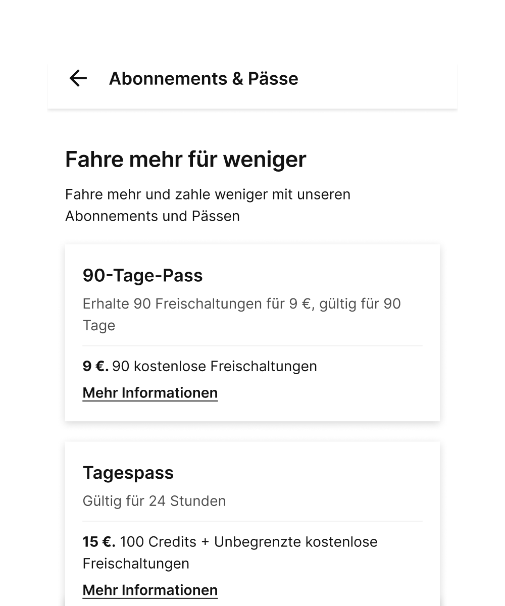 Vollständige Integration: Ermöglichen Sie die vollständige Integration Ihres Dienstes in externe MaaS-Anwendungen und ermöglichen Sie so ein nahtloses, durchgängiges Benutzererlebnis. MaaS-Anbieter können die Vermietung beginnen und beenden und Ihren Kunden direkt eine Rechnung stellen. Am Ende eines jeden Monats erhalten Sie vom MaaS-Anbieter einen Bericht mit Einzelheiten zu den ausstehenden Zahlungen.